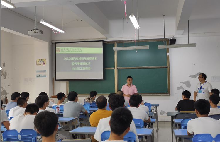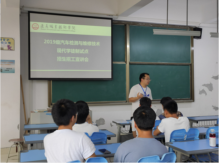 2018年10月开云体育汽车检测与维修技术专业参加贵州省省级现代学徒制试点评审答辩,2019年1月成功立项省级现代学徒制试点项目,与遵义众悦丰田汽车销售服务有限公司及遵义名成汽车科技服务有限公司合作已顺利开展了2018级现代学徒制试点教育工作。根据《教育部关于开展现代学徒制试点工作的意见》,为了提升教育教学质量,将继续合作完成2019级现代学徒制试点工作,特开展了本次2019级汽车检测与维修技术现代学徒制试点招生招工宣讲会。