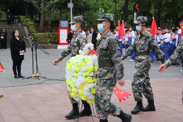 国旗护卫队的同学向红军烈士敬献花篮,全体党员、团员向革命烈士默哀,追思永远活在我们心中的英雄,并以三鞠躬向他们致以崇高的敬意和表达无尽的哀思。
