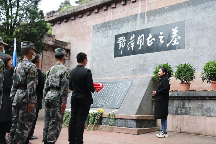 邓萍烈士墓前,何端书记为大家讲授了一堂现场党课:青山埋忠魂——邓萍。何端书记在这里讲到:邓萍同志在牺牲时年仅27岁,是革命时期的青年典范。而一代人有一代人的使命,身为当代青年大学生的我们应当学号本领,树立好正确的世界观、人生观和价值观,才能迎接时代赋予我们的使命。